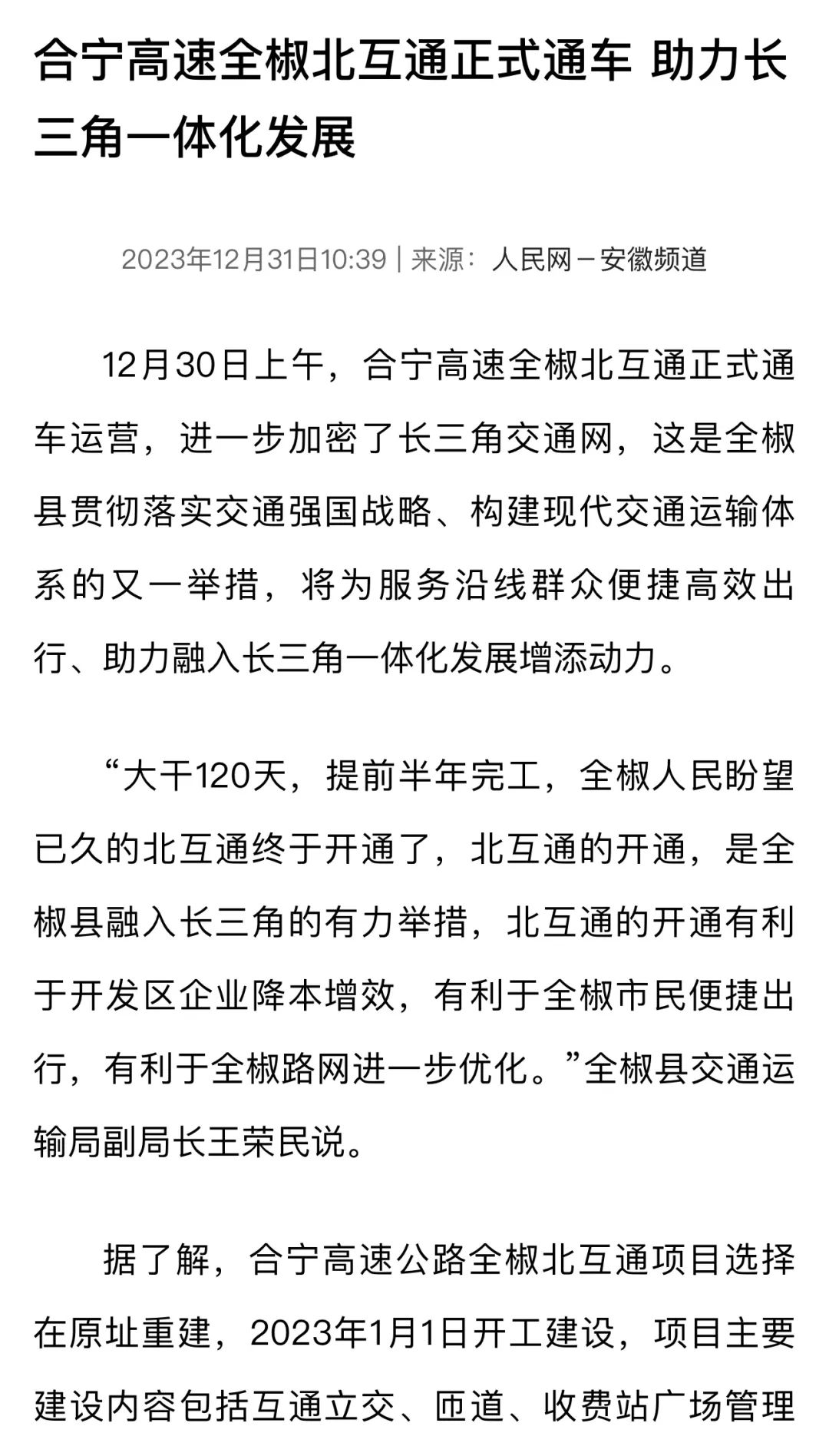 人民網安徽頻道以《合寧高速全椒北互通正式通車 助力長三角一體化發展》為題,報道合寧高速公路全椒北互通項目通車儀式的舉行。